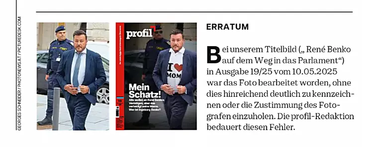 Das profil hat - nach meiner Intervention bei APA-PictureDesk - über die Agentur eine monetäre Wiedergutmachung angeboten und sich mit diesem ERRATUM im Inhalt eines der Folgehefte entschuldigt. Das muss man hoch anerkennen!
